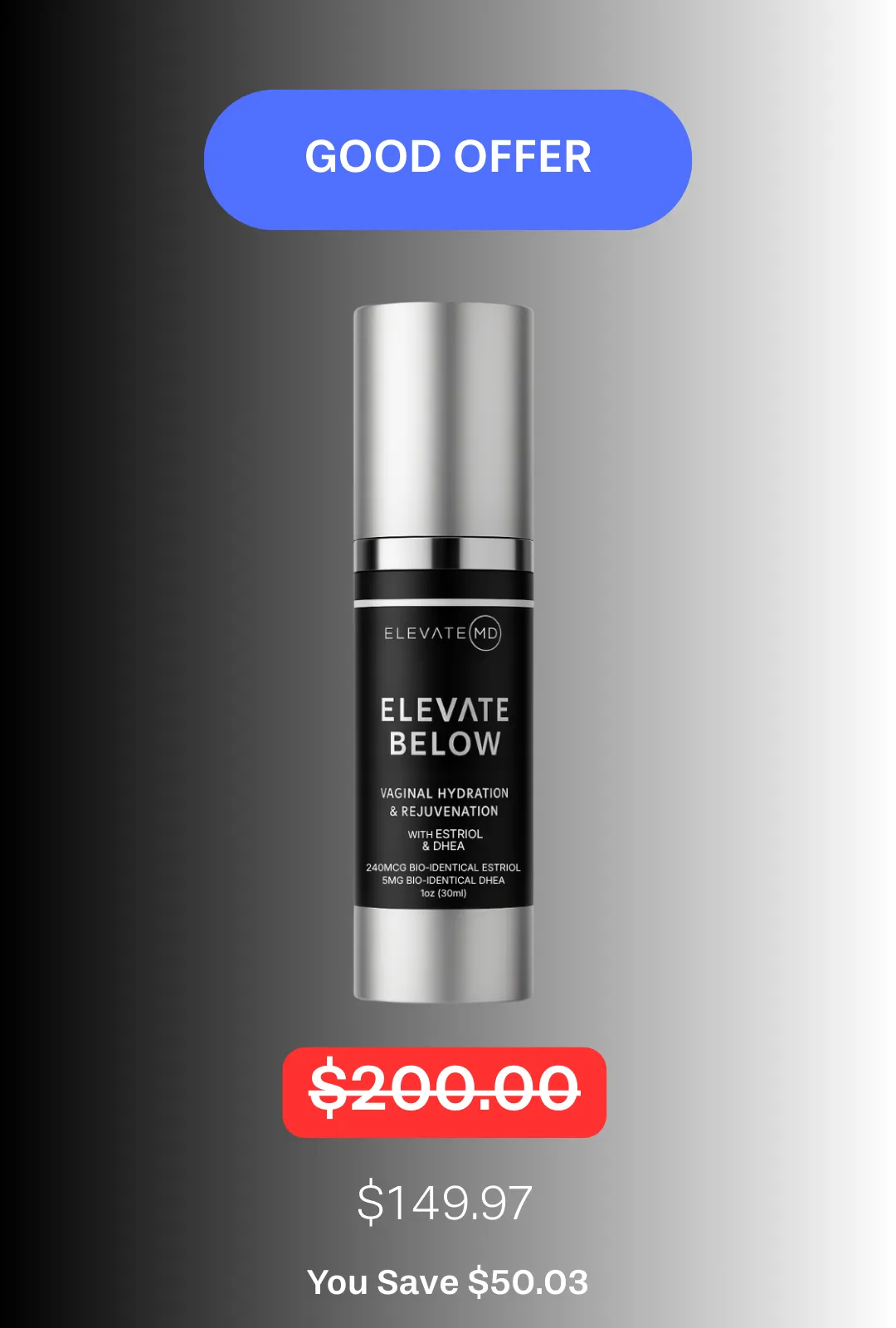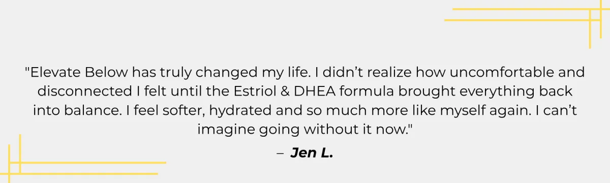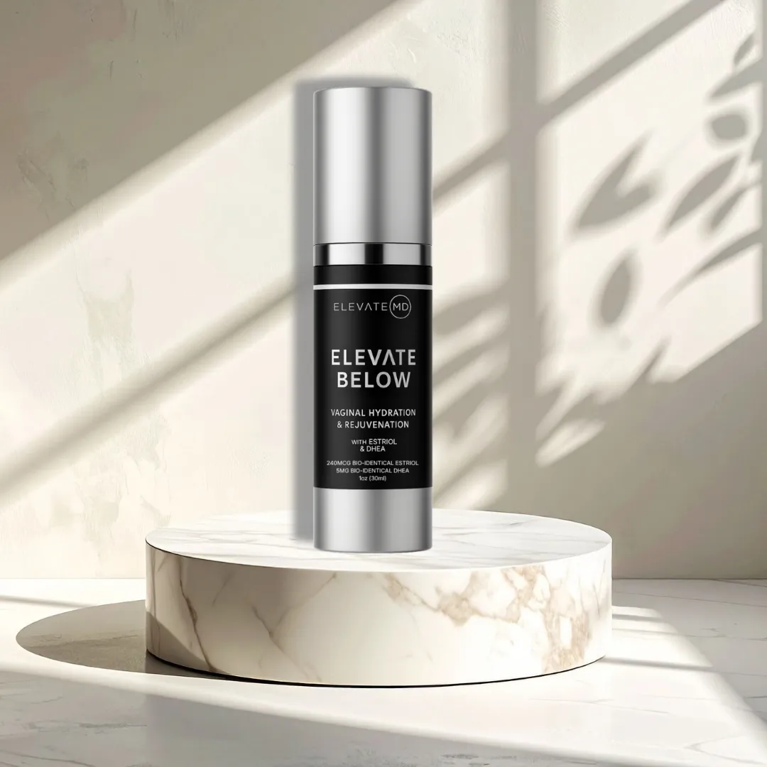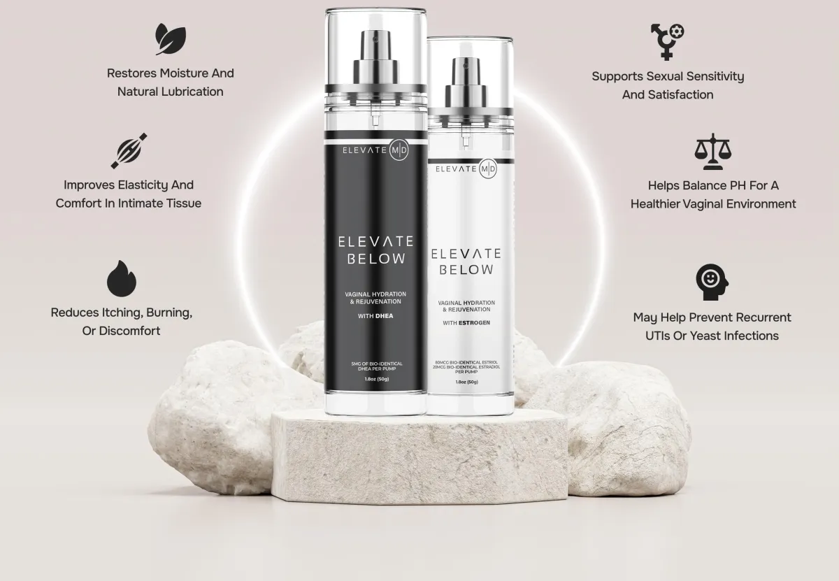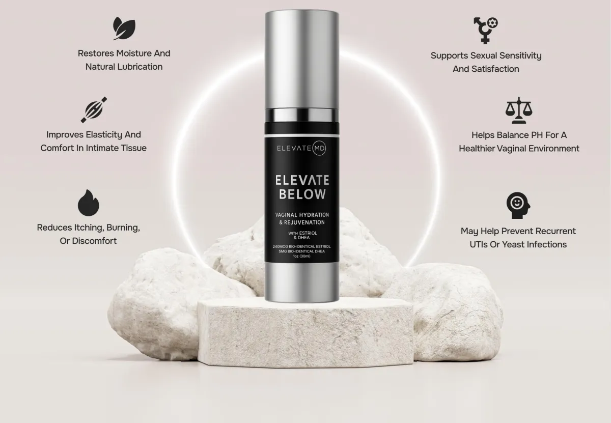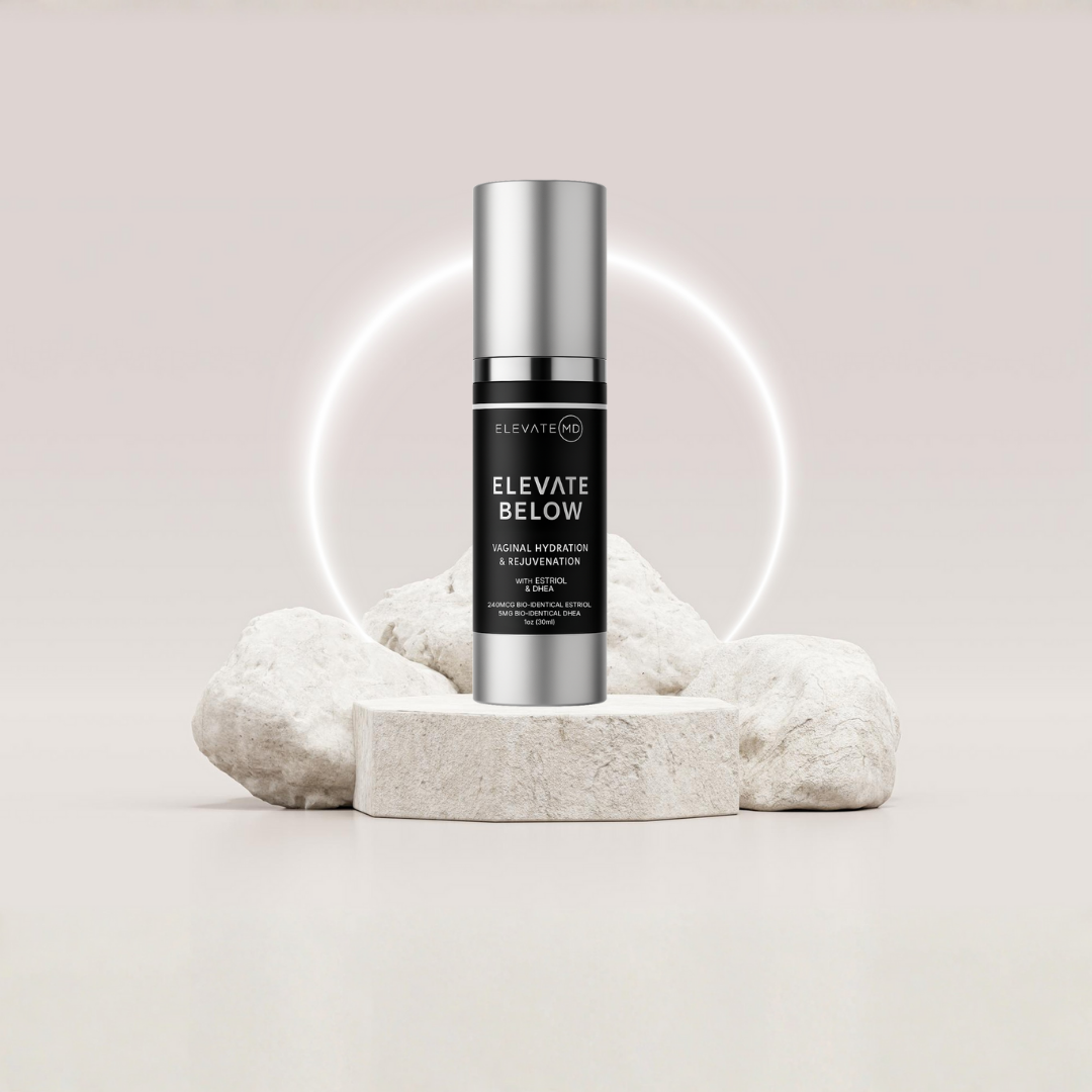 Elevate Below with Estriol & DHEA is a physician-formulated, pH-balanced vaginal moisturizer designed to replenish hydration, soothe dryness, and support overall intimate wellness. This new formula combines the best of our original Elevate Below product while also making it travel size, perfect if you need relief on the go. Infused with low-dose bioidentical Estriol and DHEA, this advanced serum helps nourish and rejuvenate delicate tissues while staying local to the area, never affecting systemic hormone levels.
