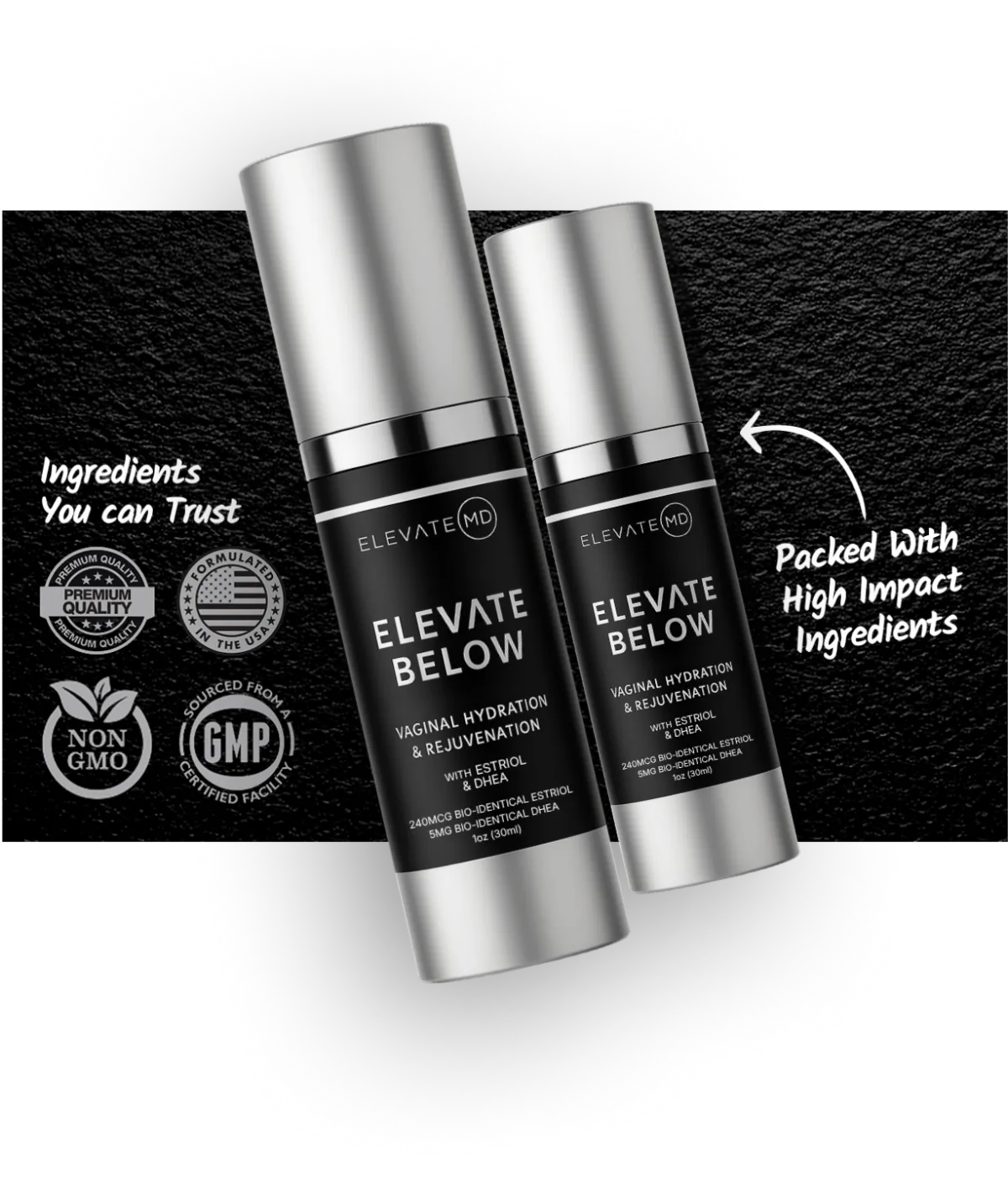 At Elevate MD, we believe intimate wellness should never come with compromise. That’s why Elevate Below is crafted with an uncompromising commitment to purity, safety, and transparency. Every ingredient is intentionally chosen, thoroughly tested, and held to the highest clinical standards so you can feel completely confident in what you’re putting on your body.